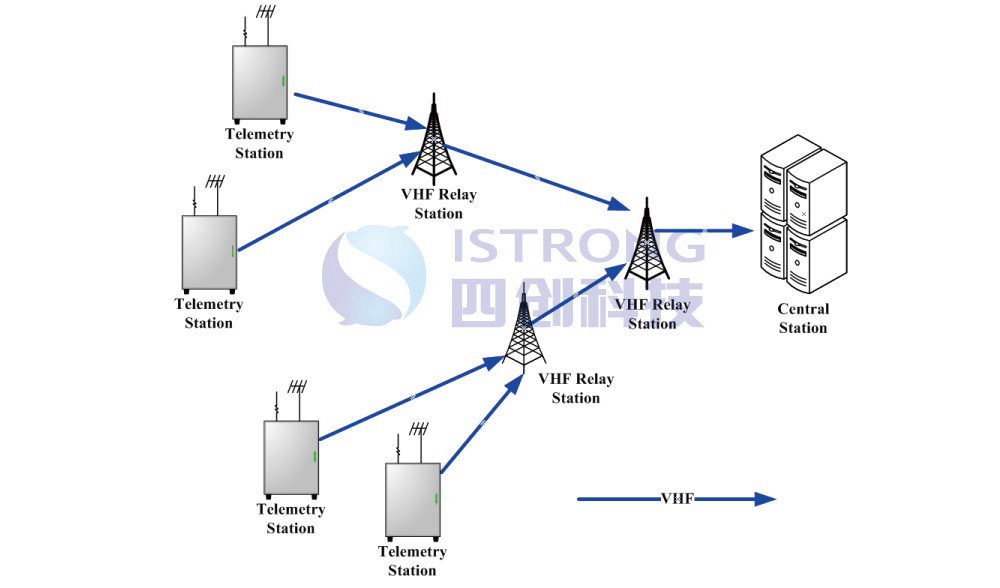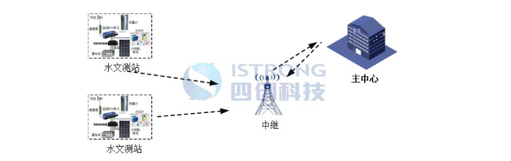 前方监测站点(水、雨)通过传感器监测相关信息,通过VHF数传电台将数据传输至中继机,中继机接收转换信号,传输至水文中心的前置机进行接收。