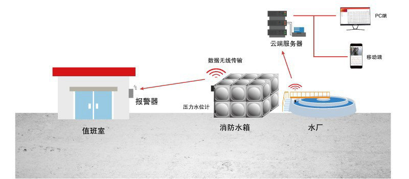 消防水池液位监测系统,基于物联网技术,利用无线水位传感器、压力式水位计、物联网智能网关、物联网云平台软件等软硬件设备,实现对消防水池水位数据的远程无线采集、传输、监控。