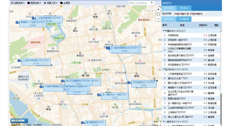 结合GIS地图展示积水监测站点的空间地理分布位置,同时以浮动的形式展示实时的积水数据。