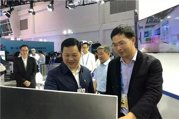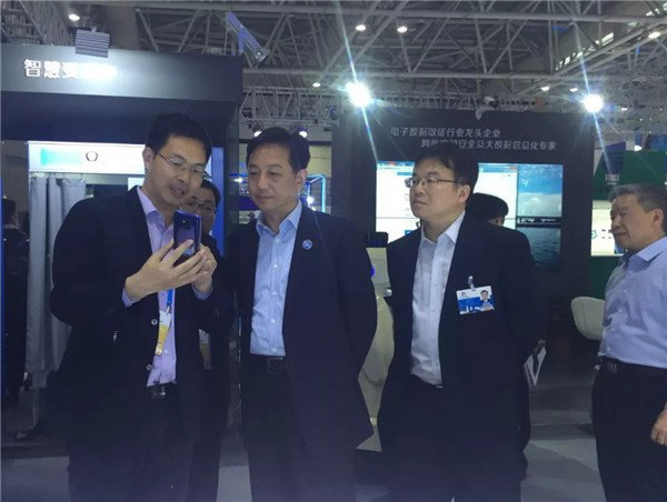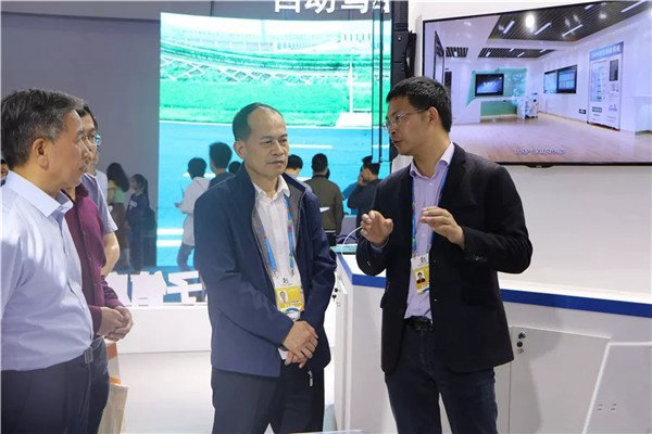 ▲福建省电子信息集团党委副书记、董事、总经理钟军(左)莅临展位视察指导
