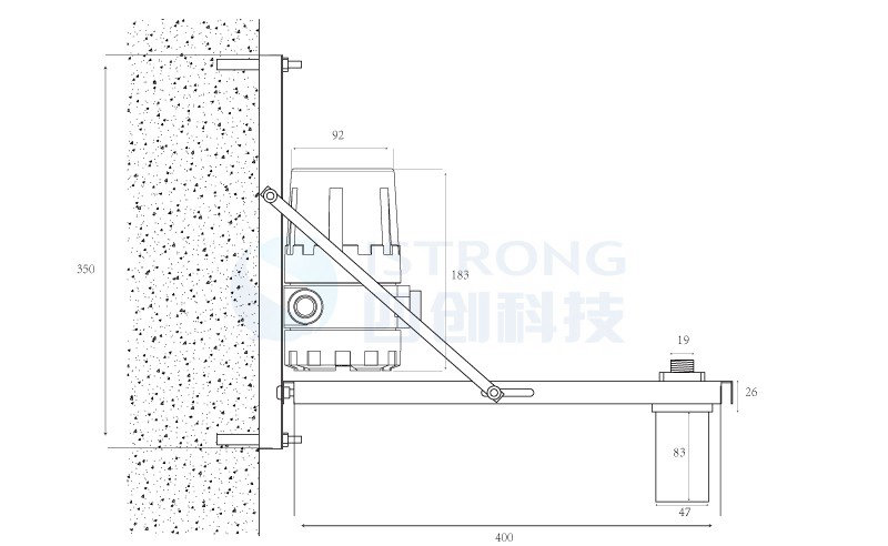 支架先通过膨胀螺丝固定在井壁上,主机和传感器固定在支架上安装,为了避免井壁干扰,直径50cm以上窨井适用。